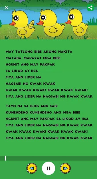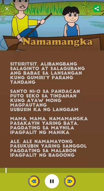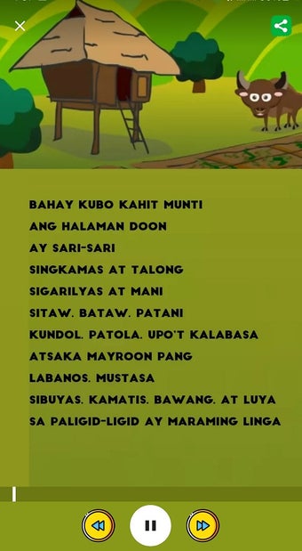 Awiting Pambata: Kids Songs – это образовательное и развлекательное приложение, которое легко и весело научит вас филиппинскому языку. В нем есть коллекция различных филиппинских песен и стихов, которые просты и понятны. В этом приложении также есть возможность выложить тексты песен, чтобы вы могли подпевать и учить песни.